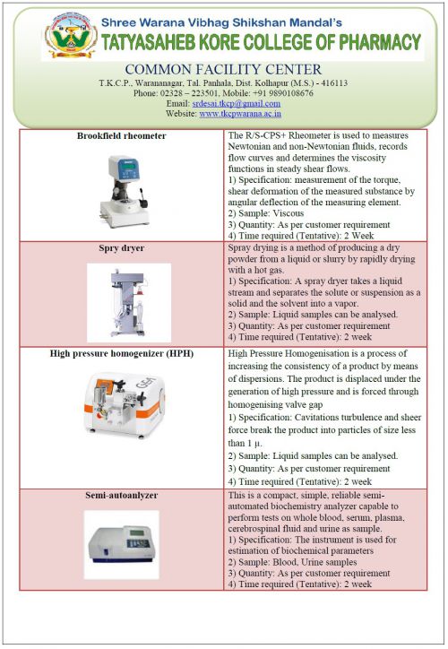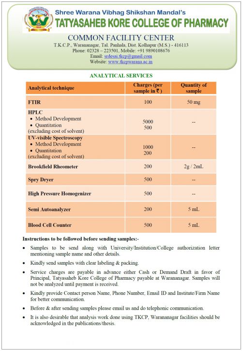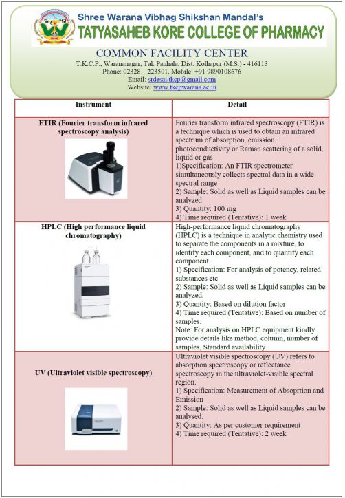College holds state of the art sophisticated analytical instrumentation facility to furnish pharmaceutical research needs. Sophisticated sensitive analytical instruments are installed at centrally located air conditioned laboratory. At present the facility is being extensively used by Ph. D. scholars, M. Pharm students and faculties of the college for their respective research activities. External organizations like industry, academic institutions can also avail the facility at nominal charges.